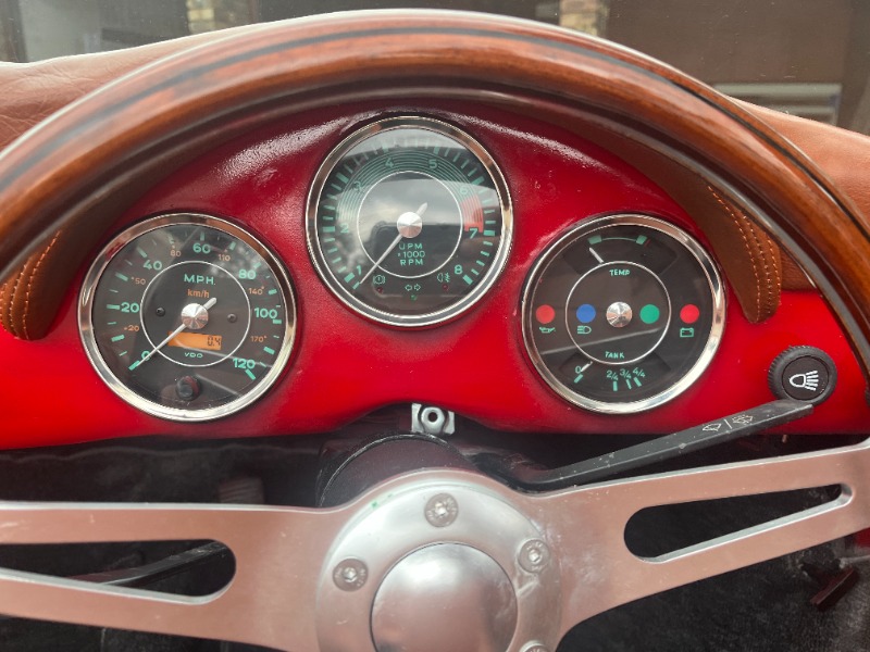 The interior boasts a genuine leather finish with square weave grey carpets and imported recreation gauges, including a digital GPS speedometer in miles. It sits on drum brakes all around and has powder-coated rims with smooth hub caps, and spare wheel included.